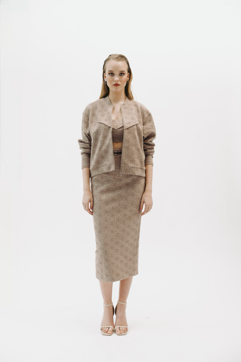 A stylish midi knit skirt with a signature print. The concealed side zipper ensures comfortable wear. The decorative front element adds uniqueness and style. The back slit provides freedom of movement and elegance. A perfect choice for everyday wear and festive occasions. Can be perfectly complemented with the Andra sweater made from the same fabric.