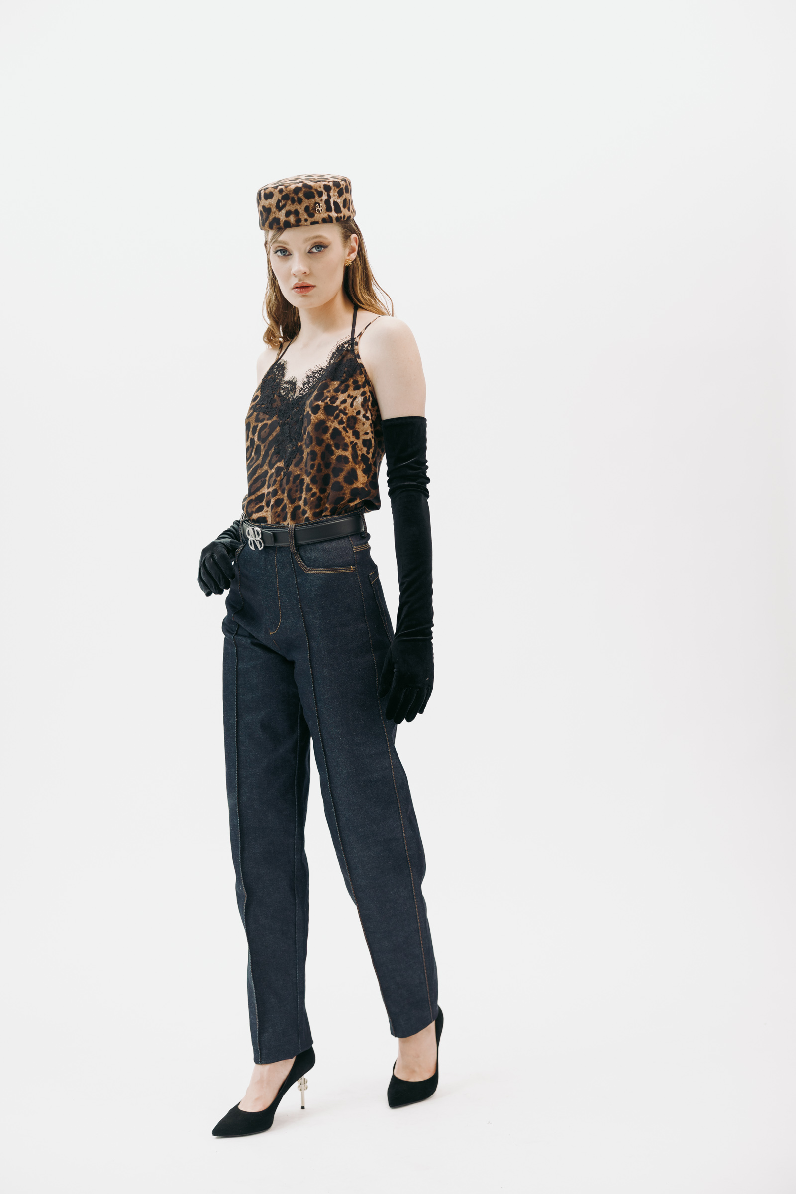 A stylish silk spaghetti strap top featuring a leopard print and black lace details. The lightweight and elegant design makes it perfect for festive occasions and evening events. Can be perfectly complemented with Uma jeans, as shown in the photo.